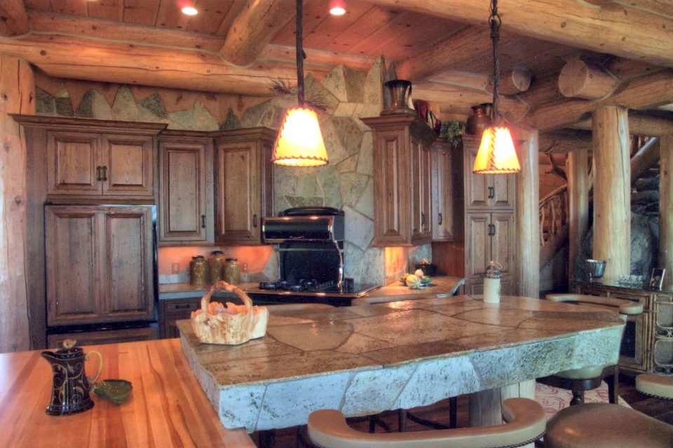 The kitchen, like the rest of the decor in this 2003 custom Log Post and Beam home, is deliberately rough around the edges. Rock from the property was used throughout the home.