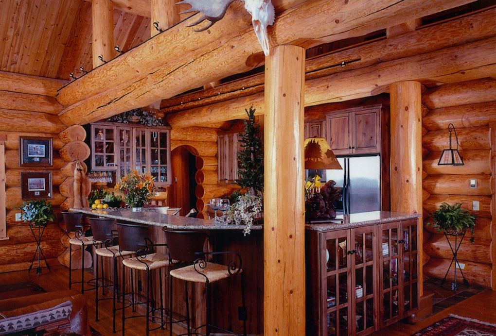 Light natural log walls and matching wood cabinetry in a Wyoming home built during the 1990s.